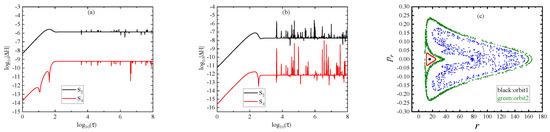(a) Hamiltonian errors in Equation (17) for the two sympletic methods and acting on Orbit 1. (b) Same as (a) but Orbit 1 replaced with Orbit 2. (c) Poincaré map at the plane with . The parameters are , , , , and in Case (ii); the initial conditions are and . Orbit 1 with the initial separation is regular, whereas Orbit 2 with the initial separation is chaotic.