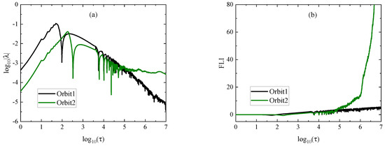where and are the proper distances of two nearby orbits at the proper time and the starting time, respectively. tends to zero for a bounded, regular orbit, while it attains a positive value for a bounded, chaotic orbit. The distinct evolution tendency of can distinguish between chaotic and regular orbits. Based on this point, the regular dynamics of Orbit 1 and the chaotic dynamics of Orbit 2 are confirmed by the maximal Lyapunov exponents in Figure 2a. The FLI is a quicker method to detect chaos and quasiperiodicity than the largest Lyapunov exponent. Its invariant definition [51] is: