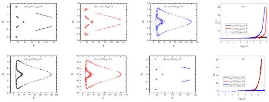 (a–c): Poincaré sections in Case (ii) of . The parameters are , , , , and is given different values in (a–c). The initial radius is . (d): The FLIs for the orbits in (a–c). (e–h): Same as (a–d), but is given and has distinct values.