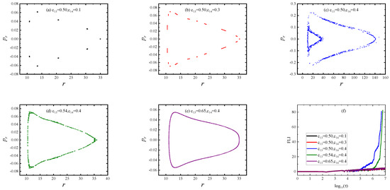 (a–e): Poincaré sections in Case (iii) of . The parameters are , , ; the initial radius is . In (a–c), , and has different values. In (d,e), , and has two different values. (f): The FLIs for the orbits in (a–e).
