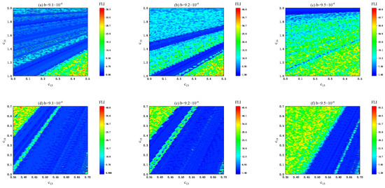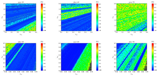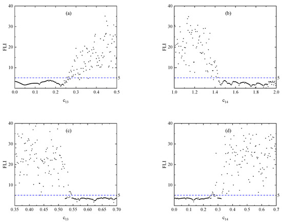 Figure 5a plots the dependence of the FLI on the coupling parameter in Case (ii), where the other parameters and the initial separation are those of Figure 3d. Each FLI is computed until the integration time reaches ; 5 is the threshold of the FLI between chaos and order. That is, all FLIs less than 5 indicate the regularity, whereas those larger than or equal to 5 show the chaoticity. Chaos occurs almost everywhere for in Figure 5a. On the other hand, there is chaos almost everywhere for with in Figure 5b. The two cases in Figure 5a,b are considered together in Figure 6a that lists a distribution of order and chaos in the binary parameter space . The region under the line is chaotic almost everywhere, while the region over the line is almost regular. The dynamics in Case (iii) are unlike that in Case (ii). Chaos occurs mainly for with in Figure 5c, and so does it for with in Figure 5d. The two cases in Figure 5c,d can be shown together through the distribution of order and chaos in the binary parameter space in Figure 6b. The main chaotic region is over the line , and the ordered region is mainly below the line.