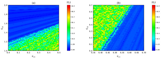 Distributions of order and chaos in the two parameter space using the FLIs. The initial radius is . (a) , and in Case (ii). (b) , and in Case (iii).