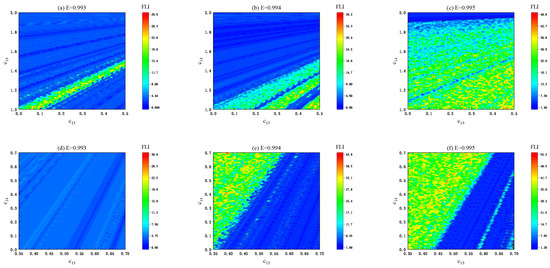 If a bounded orbit has an exponentially increasing FLI with time , it is chaotic. When a bounded orbit has an algebraically increasing FLI, it is ordered. The different deviation of two adjacent orbits with time is used to distinguish between chaotic and regular dynamics. The FLIs in Figure 2b also describe different dynamical behaviors of Orbits 1 and 2.