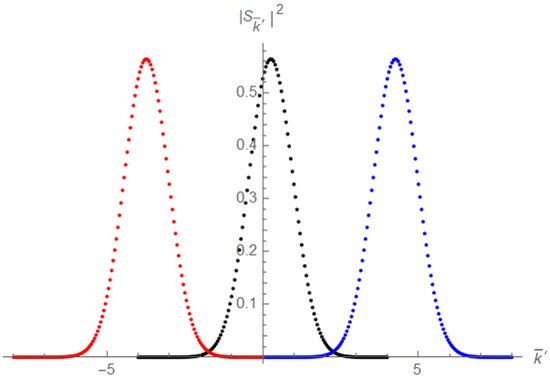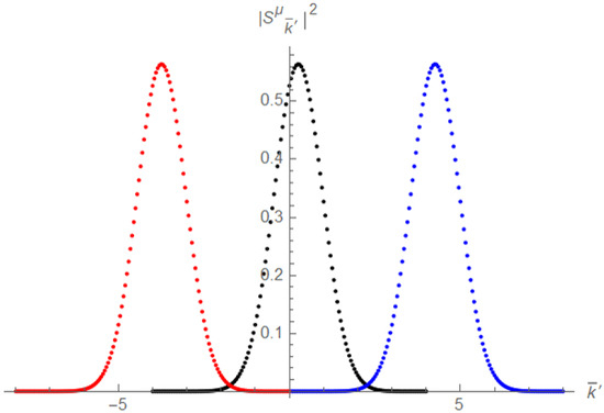 Then, polymer transition probability has been computed by using both analytical and numerical integrations. We notice that the polymer modification induced on (38) consists in the presence of global factor and that in the limit , the standard scattering amplitude is recovered. Therefore, as we can see from Figure 3, the introduction of PQM does not significantly change neither the shape of transition probability nor the position of its peak (for a comparison with the previous case, see Figure 1). In particular, as in the standard case analyzed in Section 4, the maximum of the probability density occurs in correspondence of , where is associated to the expanding Universe wave packet emerging after the interaction, and , to the collapsing one. The absence of relevant effects is due to the fact that in (38), the exponential factors of the Gaussian coefficients dominate over polymer global factor in the integral.
