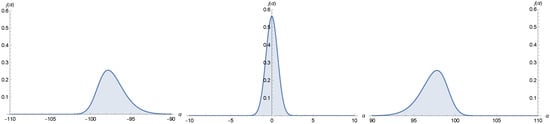 where . The main difference is represented by the dispersion relation (i.e., the relation between the quantum eigenvalues of the momenta), which stops being linear. It can be shown that this fact is responsible for the spreading of the wave packet (see Figure 2). Therefore, the comparison between the semiclassical trajectory and the evolution of the quantum wave packet loses its meaning, since the variance sooner or later becomes of the same order as the expectation value, making it necessary to resort to a fully quantum treatment. This behavior of the FLRW Universe wave packet in the polymer representation further consolidates the study of the Big Bounce as quantum scattering. We remark that PQM is not able to solve the singularity of the FLRW model in the Misner variable (see [25,26], where this argument is used to demonstrate the presence of the initial singularity in the Bianchi IX model); so, no semiclassical bouncing dynamics is present in this model.