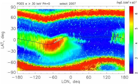 Map of maximum electron fluxes with energies >30 keV in geographic coordinates according to five NOAA/POES satellite measurements at an altitude of 850 km for one-year interval. The intensity I is presented in a color logarithmic scale. The magnetic equator is shown as a black curve. The projection of the outer ERB looks like bands at high latitudes (>50°) with intense electron fluxes. The projection of the inner ERB looks like a large spot in the SAA region at low latitudes in the sector of longitudes from −100° to 0°. The forbidden zone is located near the equator outside the SAA region, namely, it is an area of weak electron fluxes (colors from blue to yellow) in the range of latitudes from 40° S to 40° N and longitudes from 0° to 180° E and from 100° W to 180° W.