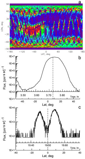 The identification of FEE events is based on daily geographic maps of >30 keV electron fluxes. The daily maps are used for selection of days when strong FEE enhancements exceed the background fluxes by several orders of magnitude. As a rule, the background fluxes did not exceed ~102 (cm2 s sr)−1. Thus, an FEE event is defined as all increases above 104 (cm2 s sr)−1 in fluxes of quasi-trapped electrons observed in the forbidden zone on one day [13]. An example of an FEE event is shown in Figure 2a. Note that the FEE enhancement is different from precipitating electron fluxes reported, for example, by Grigoryan et al. [16]. First, the FEE enhancement has a gradual time profile of a “dome” shape, as shown in Figure 2b, with the maximum located near the magnetic equator (see Figure 2a). In contrast, the precipitating fluxes have two maxima at latitudes >10° off the equator, as shown in Figure 2c. Secondly, the intensity of precipitating fluxes rarely exceeds 103 (cm2 s sr)−1, while the vast majority of FEE events are characterized by high intensities of ~104 (cm2 s sr)−1 and above [8].