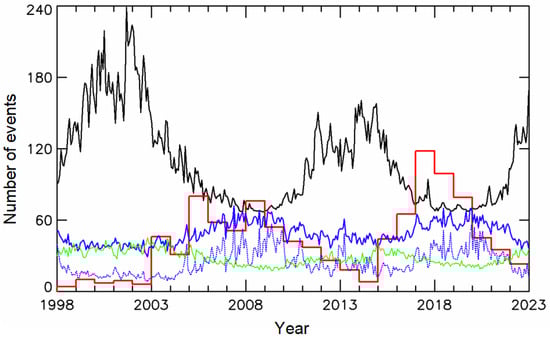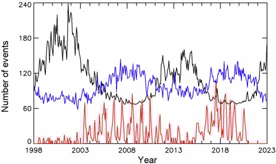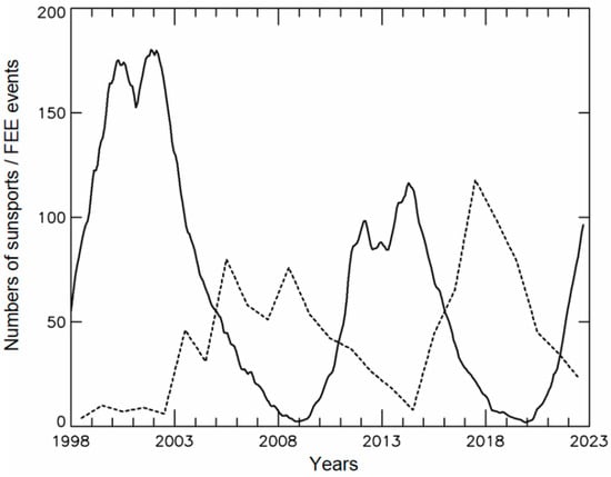Statistics of FEE enhancements were compared with solar activity variations. Solar activity is characterized by the number of sunspots provided by WDC-SILSO (Royal Belgian Observatory, Brussels). The time period from 1998 to 2023 (25 years) covers the 23rd solar cycle from 1998 to 2008, the 24th solar cycle from 2009 to 2019, and the rising phase of the 25th solar cycle from 2020 to 2022. Hence, the data set acquired from the POES and MetOp satellites includes two solar maxima and two solar minima. Figure 3 shows variations in the occurrence number of FEE events per year and the yearly-smoothed monthly sunspot number over 25 years. The power of the solar cycle is determined by the sunspot number in the solar maximum. The last two cycles of the 24th and 25th are weaker in power to the 23rd. The time period under study begins in the middle of the rising phase of the 23rd cycle (1998–1999), during which few events were detected (less than 10 per year). Taking into account the fact that only one satellite was operating at that time (see Table 1), the number of events is most likely underestimated. For the rest of the interval (from 2000 to 2022), the reliability of the data is well supported statistically.