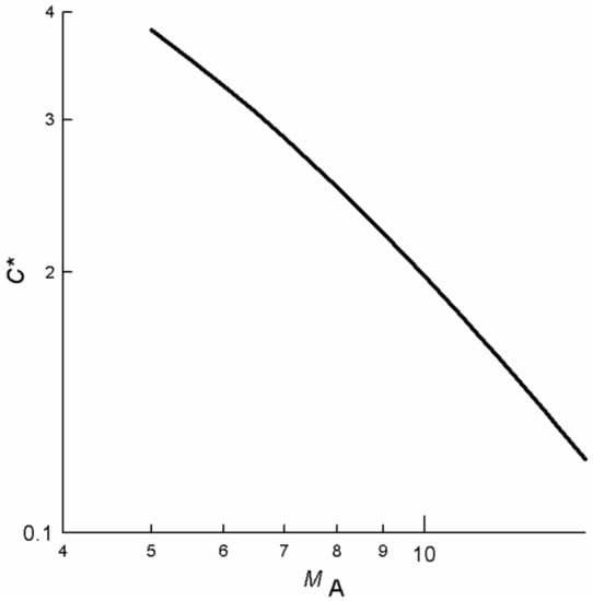 Dependence of the function C* on the Alfven Mach number MA calculated by Equation (3).