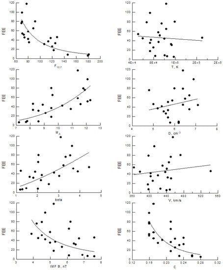 In the present study, the technique of multi-parametric regression is used mainly for estimation of the qualitative dependencies (correlation/anticorrelation) on the driving parameters, which have a deep physical meaning. For instance, the strong anticorrelation between FEE and F10.7 can be associated with the fact that the F10.7 index controls the ionization and, hence, conductivity of the dayside ionosphere. The physical relations of the FEE with the driving parameters will be discussed in the next section. Due to the small statistics, we use the criterion of chi-square (χ2) for the validation of the results presented. For the regression in Equation (4), the parameter chi-square is equal to χ2 = 7.4, which corresponds to a 99% goodness of fit for the regression of four variables and 23 data points.