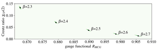 Random gauge copies are usually determined by random gauge matrices with a homogeneous density on the SU(2) group manifold, as produced by the Box–Muller method [53]. One can directly produce consecutively increasing local maxima of the gauge functional using a bias in the random gauge transformations by restricting them to the trivial sector of the residual gauge group which the maximal center gauge condition (2) leaves free. For we have to choose random gauge matrices with positive trace. In the two diagrams in Figure 1, we show the maximizing histories for 2 independently created field configurations (out of 200) and for 10 of their random gauge copies. For each of these 20 field configurations we perform 100 times the following two steps: First, we maximize the functional by gradient ascent. Secondly, we apply the biased random gauge transformations. For center projected field configurations of sufficient large lattice size already one configuration can reasonable estimate the string tension from Creutz-ratios