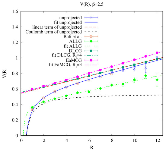 For we show in Figure 3 the potential values of unprojected configurations, the fit potential , its contributions and together with the data of [54]. We compare them with the potentials and their fits resulting from the three center projection methods, ALLG, DLCG, and EaMCG. ALLG has a sizeable Coulomb contribution, differing in this respect from DLCG and EaMCG. Its potential is more difficult to resolve than for DLCG and EaMCG. ALLG has a smaller linear term than DLCG, where this term agrees nicely with the linear term of the unprojected configurations. Over the whole R region the EaMCG values are very well resolvable and start at to predict a stable value for the string tension . It is interesting to observe in Figure 3 that, despite the linear term is larger than for DLCG and the unprojected configurations, the potential runs at large R nicely parallel to the unprojected potential. When fitting the potential from unprojected configurations, the Coulomb factor is reasonably close to , fixing the latter value in the fit changes the other fit parameters more or less within errors only, as can be seen from the numbers in Table 1.