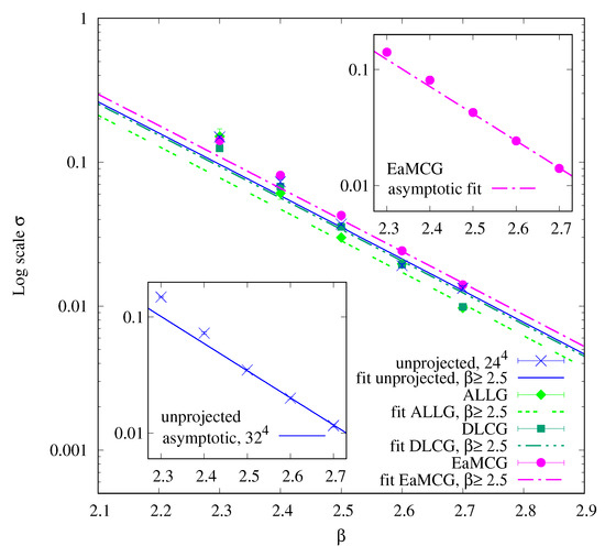 where is the standard lattice scale parameter. In Figure 5, we compare the string tensions extracted from unprojected configurations and the three methods of center projection, see Table 1, with the asymptotic freedom prediction of Equation (14). The main diagram shows the results of our calculations on a lattice. In the insets we show fits to the asymptotic behavior , in the upper inset for EaMCG and in the lower inset for unprojected configurations on a lattice. All our obtained results, including EaMCG data, approach the expected asymptotic scaling with increasing .