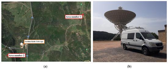 (a) Map of the measurement campaign scenario. Area number 1 and Area number 2 are situated at an altitude comparable with the position of the primary focus of SRT, and represent the optimal points to perform the measurements; (b) photo of the INAF mobile laboratory with the Sardinia Radio Telescope in the background.