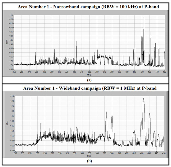 (a) The P-band spectrum, between 250 and 450 MHz, measured in the narrowband campaign (i.e., spectrum analyzer RBW set to 100 kHz) for detection of continuous signals in area number 1; (b) the P-band spectrum, between 250 and 450 MHz, measured in the wideband campaign (i.e., RBW set to 1 MHz) for detection of impulsive signals in area number 1.