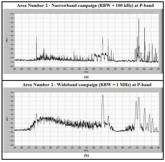 (a) The P-band spectrum, between 250 and 450 MHz, measured in the narrowband campaign (i.e., spectrum analyzer RBW set to 100 kHz) for detection of continuous signals in area number 2; (b) The P-band spectrum, between 250 and 450 MHz, measured in the wideband campaign (i.e., RBW set to 1 MHz) for detection of impulsive signals in area number 2.