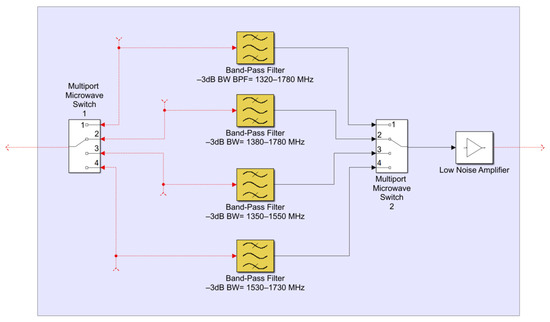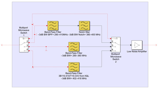 Finally, as well as for the P-band channel of the L-P receiver, a schematic of the new filter selector block is reported in Figure 9. The schematic is similar to that of the P-band channel. The difference lies in the filter models for each radio frequency path.
