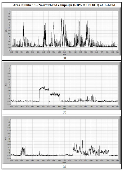 The L-band spectrum, between 1200 and 1800 MHz, measured in the narrowband campaign (i.e., RBW set to 100 kHz) for detection of continuous signals in area number 1. The spectrum has been divided in three sub-bands. each of them of 200 MHz: (a) the sub-band between 1200 and 1400 MHz; (b) the sub-band between 1400 and 1600 MHz; (c) the sub-band between 1600 and 1800 MHz.
