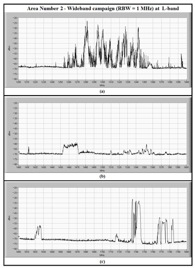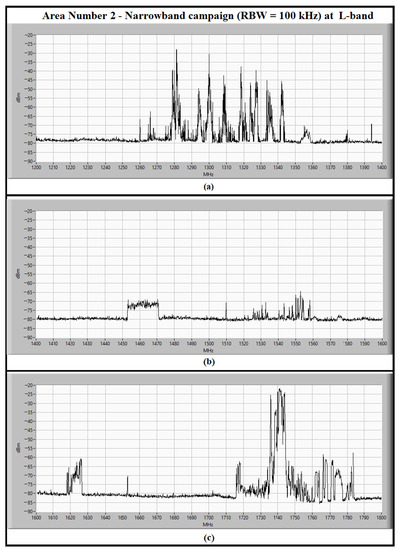 The L-band spectrum, between 1200 and 1800 MHz, measured in the narrowband campaign (i.e., RBW set to 100 kHz) for detection of impulsive signals in area number 2. The spectrum has been divided in three sub-bands, each of them of 200 MHz: (a) the sub-band between 1200 and 1400 MHz; (b) the sub-band between 1400 and 1600 MHz; (c) the sub-band between 1600 and 1800 MHz.