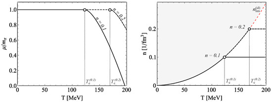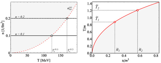 As a referring point, let us give a reminder about the main properties of the Bose condensation in a single-component ideal gas at conserved particle-number density n. This is shown in Figure 1, where two samples of the particle-number density are presented, fm. The red dashed line is the critical curve that determines the critical temperature . The critical curve is the dependence of the particle-number density on the temperature at the maximum value of the chemical potential, which is equal to the particle mass, 1. Thus, the formula that determines the critical curve reads