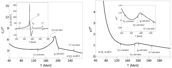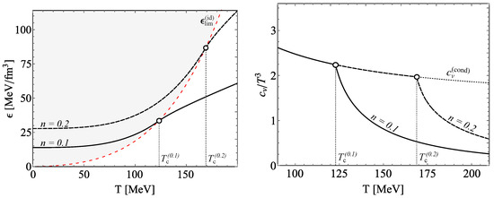 The results of calculation of the energy density and heat capacity represented in Figure 2 evidently show that at the crossing point of the particle-number density and the critical curve, the phase transition of the second order occurs. Indeed, there is a finite discontinuity of the derivative of the heat capacity in the points and a smooth behavior of the energy–density dependence in these points, i.e, there is no release of the latent heat.