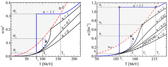 Left panel: scalar density vs. temperature, , . Right panel: particle-number density vs. temperature, , . In both panels, the shaded area indicates the states of the Bose–Einstein condensate. Crosses on both panels separate metastable and non-physical states.