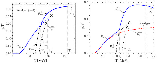 The same analysis is made also for the TMF model. We solve Equation (51) to obtain the dependence of the particle density in the thermal (liquid–gas) phase and a corresponding pressure . Equation (52) is characterized by two constant real roots and and two corresponding pressures. The result of this comparison is depicted in Figure 4 in the right panel as the solid blue line.