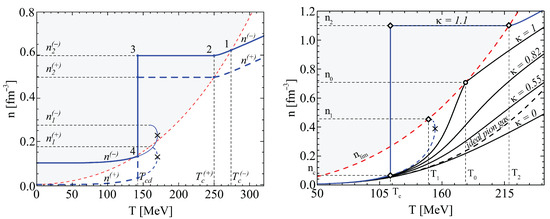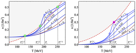The numerical calculations of the particle density vs, temperature for the SMF model and TMF model are presented in Figure 3 in the left and right panels, respectively. The calculations are done for different values of the attraction coefficients a and A, which are parameterized by parameter in both models. We name as the “weak” attraction and as the “strong” attraction. It is seen that for “weak” attraction, the scalar densities and the particle number densities are in the thermal phase. At , the density curves have one common point with the critical (red dashed line). The critical curve is depicted in Figure 3 in the left panel as a red dotted-dashed line, and the critical curve is depicted in Figure 3 in the right panel as a red dashed line. In both approaches, at “strong” attraction, , there is a first-order phase transition at with creation of the condensate. This is a result of competition of pressure corresponding to two different solutions of the self-consistent equation in the thermal and in the condensate phases.