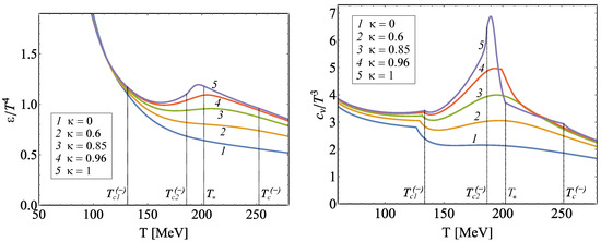 where . The solution of Equation (51) in the thermal phase results in the explicit dependence , which in general differs from the ideal gas dependence, . Knowledge of the dependence gives a possibility to obtain equation of state through a direct calculation of other thermodynamic quantities such as pressure, energy density, entropy density, etc.