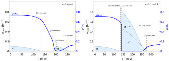 This is also the case in our particular consideration of the relativistic particle–antiparticle boson system with conserved isospin charge . Indeed, it can be seen in Figure 10 in the left panel in the temperature interval that corresponds to the condensate phase, i.e., between points 2 and 3 on the graph, that for each temperature from this interval, the thermal density of mesons is equal to the thermal density of mesons, since these two densities are equal to . In other words, these kinetic densities are equal to the critical curve density. Therefore, the charge density, which is determined only by thermal particles and antiparticles, is zero. Respectively, the chemical potential, which corresponds to the charge of the system, which is determined only by thermal particles, is also zero. In addition, we see that the chemical potential is really useful for describing only thermal or kinetic particles. Actually, this can be understood from the very beginning, because the chemical potential “works” in the integral (in the distribution function), which determines only the density of kinetic particles.