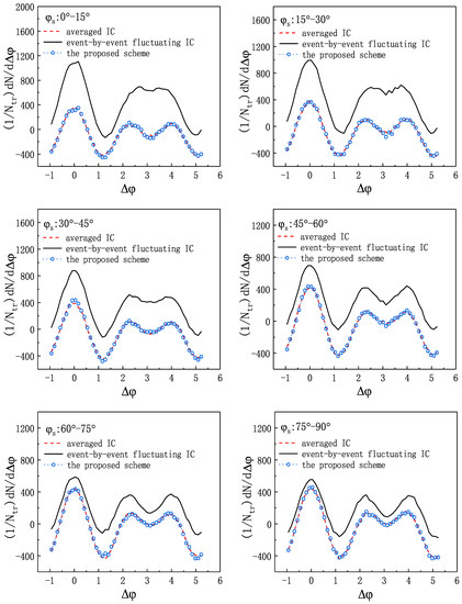 However, one may also perform the numerical simulations by manually removing the event-by-event fluctuations in the background. This can be achieved by assigning in Equation (12). The rest of the calculations essentially remain the same. The red dashed curves in Figure 2 show the resultant subtracted two-particle correlations.
