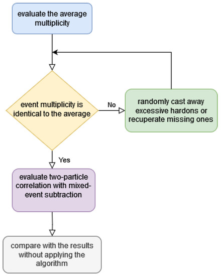 Based on the above arguments, we propose the following scheme for calculating the two-particle correlations using the cumulant as shown in Figure 3. Instead of using all the emitted hadrons, one normalizes the multiplicity of different events to their average value when evaluating particle pairs. Specifically, if one event has more hadrons than the average number, excessive ones will be cast away. These hadrons will be chosen randomly. On the other hand, if one event has fewer hadrons than the average number, the insufficiency will be compensated by randomly choosing some hadrons for a second time. By employing the above strategy, one always has the same number of hadron pairs in calculating the cumulant. The multiplicity fluctuations will be effectively removed.