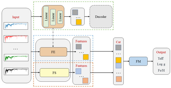 For the ESNet model, the spectra are used as inputs, while the corresponding stellar parameters serve as labels. Spectral features are extracted using the FE and FS modules. The features extracted by the FE and FS modules are fused. Subsequently, the FM maps the fused features to the stellar parameters.