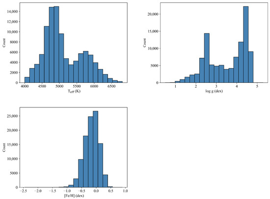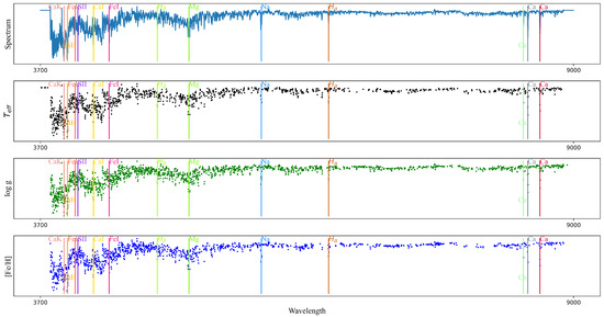 SDSS [31] houses an extensive collection of astronomical data, spanning a vast region of the sky. These data include essential information such as the position, brightness, and spectral details of billions of celestial objects, along with their physical properties. SDSS also offers a wide range of data, including images, galaxy redshift measurements, galaxy photometry, and a comprehensive catalog of sky survey objects. Additionally, the wavelength range covered by the SDSS DR17 APOGEE spectra with a resolution of R 22500 [32] spans from 3800 to 9200 Å, and high-quality atmospheric parameters [, , , ] are provided. Estimating atmospheric parameters using high-resolution spectra is more accurate [28]. Thus, in the paper, APOGEE’s labels are used. The APOGEE Stellar Parameter and Chemical Abundances Pipeline (ASPCAP) [33] is a software pipeline for the analysis of stellar spectra, mainly used to process spectra from the Apache Point Observatory Galactic Evolution Experiment (APOGEE). ASPCAP aims to extract stellar parameters (e.g., , , metal abundances, etc.) and chemical abundances (e.g., elemental abundances) from stellar spectra.