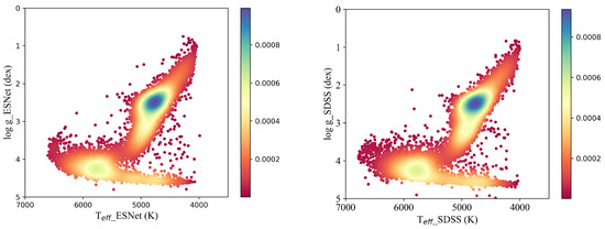 The distribution diagram of the catalog on and . The left one is the ESNet predictions, and the right one is the labels (SDSS catalog). Color bar represents the density of data points with a change in color. Larger values on the color bar indicate greater density.