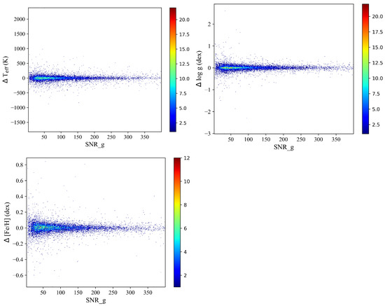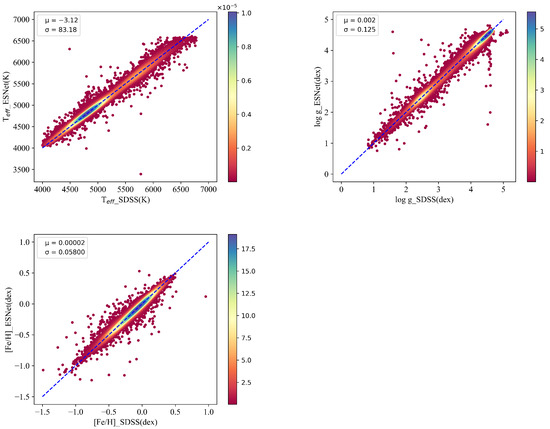 The consistency between the ESNet predictions and the labels is thoroughly analyzed and evaluated. Scatter density plots for the stellar parameters , , and are presented in Figure 6, providing a visual representation of the relationship between the ESNet predictions and the labels.