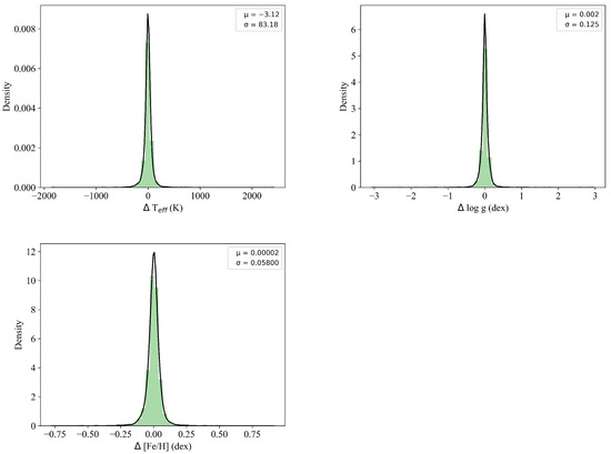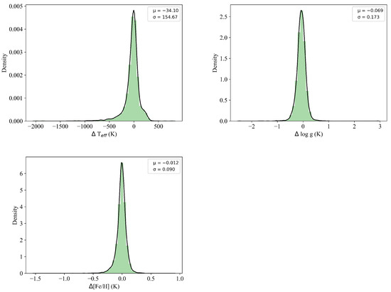 Additionally, histograms depicting the differences between the ESNet predictions and the labels are shown in Figure 7. The experimental results reveal that the diagonal distributions in the scatter density plots (Figure 6) align closely with the 45° line, indicating that there is no significant systematic deviation between the ESNet predictions and the labels, and the ESNet model exhibits good consistency in predicting the stellar parameters.