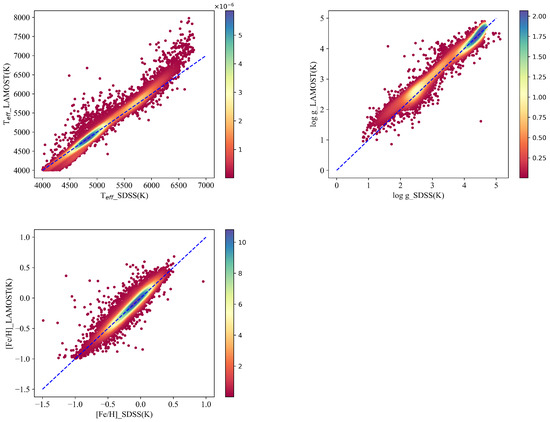 Consistency between the LAMOST catalog and SDSS one. The upper left figure refers to ; the upper right figure refers to ; the bottom left figure refers to . Color bar represents the density of data points with a change in color. Larger values on the color bar indicate greater density.