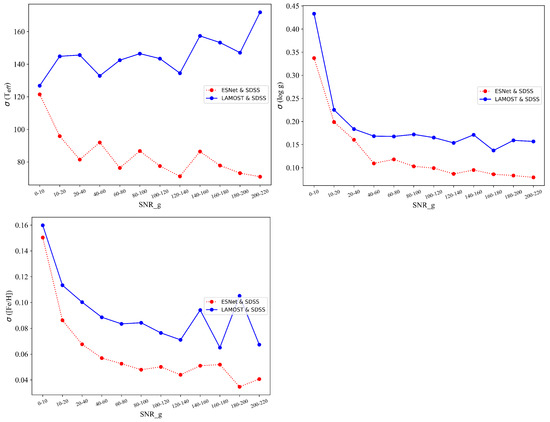 Additionally, we explore the influence of the SNR on the dispersion . The results indicate that the dispersion between the predictions (including , , ) and the SDSS catalog is smaller than the dispersion between LAMOST and SDSS. The experimental findings demonstrate a higher level of consistency between the predicted stellar parameters and the SDSS catalog, indicating the better stability of ESNet, as illustrated in Figure 13.