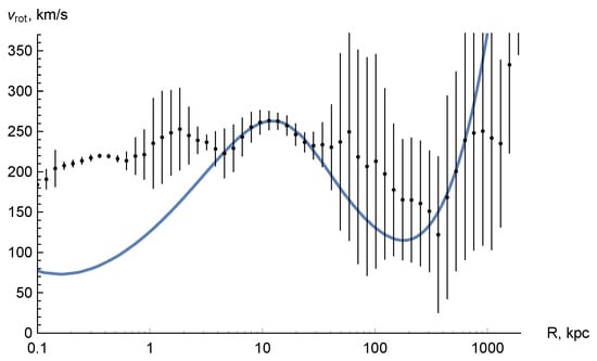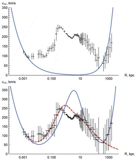 The result of the calculations for the Milky Way Galaxy rotational curve is shown in the lower panel of Figure 3. As one can see, the simple model with smeared disk describes the baryonic matter roughly, but the observed rotational curve has a more complicated structure.