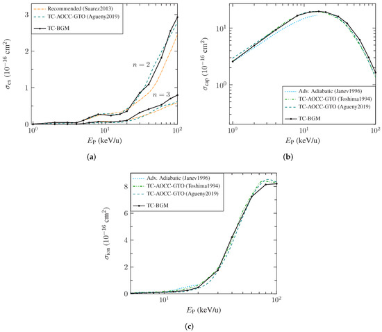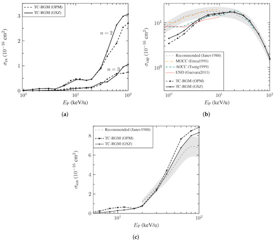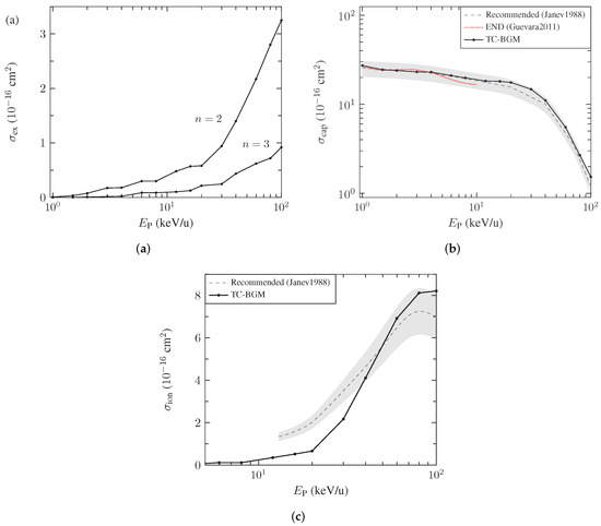 The cross section results for the Li-H(1s) collision system are shown in Figure 1. Starting with the n-state excitation cross sections (Figure 1a), the present TC-BGM results are compared with other calculations. The work by Suarez et al. [21] reported recommended excitation cross sections based on the two-center one-electron diatomic molecule expansion covering 1 to 80 keV/u and the one-center Bessel expansion that covers energies greater than 80 keV/u. The work by Agueny et al. [22] was based on the two-center atomic orbital close-coupling method with Gaussian-type orbitals (TC-AOCC-GTO). Only the excitation of the and shells are presented, since transitions to higher energy states are not important at these impact energies [21]. It is shown that the present TC-BGM results are in satisfactory agreement with previously reported cross sections [21,22].
