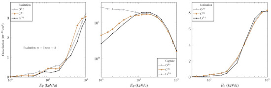 We also drew a few comparisons of the cross sections across the different projectiles. This is summarized in Figure 5 where the total cross sections for excitation, capture, and ionization for all three collision systems are plotted together. One can observe the similarities in the energy dependence of the excitation and ionization cross sections across the three systems. For capture, the differences in cross sections are significant at 10 keV/u and below, indicating that the precise form of the screening of the projectile nucleus matters.
