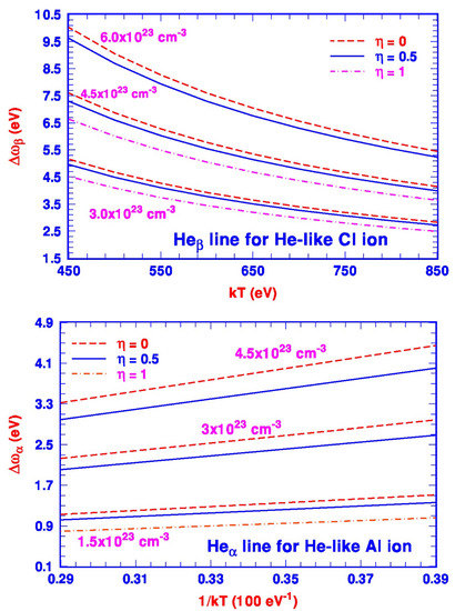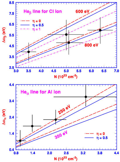 Finally, we should comment again on the size factor . As we stated earlier that there is no good a priori theoretical prescription to determine its value, therefore, the most appropriate for the theoretical calculation would depend on the good agreement between the theoretically calculated and the measured data such as those shown in Figure 3. The interplay between the theory and experiment could refine the value of and offer a more reliable and accurate determination of the energy shifts of the emission lines at a given combination of plasma temperature and density. In addition, as we indicated earlier that although the temperature variation of at a fixed plasma density based on the limited experimental date appears to support the use of the classical Maxwell–Boltzmann statistics over the Fermi–Dirac distributions for the outside plasma, more experimental measurements are needed for such a conclusion.