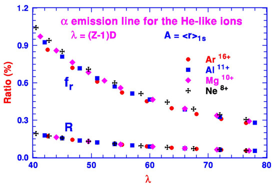 Encouraged by the agreement between our theoretical results on the Lyman- emission of the H-like ions and the experimental observation, as well as other more detailed theoretical calculations, we moved on to study the and emissions of the He-like ions. With the electron–electron correlations between the atomic electrons taken into account fully based on the non-relativistic and relativistic multiconfiguration atomic structure calculations outlined in Section 2, we carried out calculations for the He-like Ne, Al, and Ar ions with the radius of the Debye sphere given by , where is the average radius of the ground state of He-like ions and is a size parameter. Our calculations led to (i) the plasma-free transition energies for all three He-like Ne, Al, and Ar ions, in close agreement with the NIST values [48], and (ii) the ratio R shown in Figure 2 between the energy shift and the plasma-free , which follows a nearly universal curve for each size parameter as a function of the reduced Debye length for all He-like ions with Z meeting the spatial and temporal criteria of the DH approximation. This is qualitatively consistent with what we already pointed out earlier in Section 2, following the quasi-hydrogenic picture based on Equation (7). For the He-like ions with relatively low Z, the relativistic interactions are small, and indeed, this was confirmed by the nearly identical values R for the He-like ion between the non-relativistic and relativistic results shown previously in Figure 5 of [21]. For the intermediate Z, the DH approximation did not work due to the spatial and temporal criteria, as we pointed out earlier. As Z increases further, the DH model should apply again, and the effect of the relativistic interaction was clearly shown for the heavier He-like Yb and Au ions as the values of R deviated substantially from the ones for He-like O ion, shown also in Figure 5 of [21]. Our discussion below for the plasma effects on ions with relatively low Z was mostly based on the data from our non-relativistic calculations.