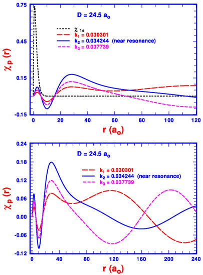 We limit our detailed discussion on the application of the DH approximation to the photoabsorption of the hydrogen ground state subject to the plasma environment and examine first with the Debye lengths D substantially greater than the radius of the orbital to keep the plasma effect on the the orbital wavefunction small. Qualitatively, one of the most outstanding features of the DH approximation is the upwards migration of the bound excited state as the Debye length D decreases. Corresponding to each bound excited state, there is a critical value of D such that the state is pushed into the continuum. In particular, we focus our discussion on the plasma-induced resonant structures in the photoabsorption spectrum from the hydrogen ground state between 989 Åand 992 Å, which are associated with the plasma-free to Lyman- line at 972.5 Å. Following the earlier plasma-free example, but with the Debye length at a critical length of 24.5 given in [19] due to the outside plasma, the top plot of Figure 7 compares the radial orbital function to three orbitals representing the outgoing electron near the ionization threshold at three momenta and , respectively. It is interesting to note that although the locations of their first local maxima and the subsequent zeros for the first loop from for all three are similar to the plasma-free ones shown in Figure 6, their magnitudes are very different as k varies. At and , the magnitudes of their first loop are relatively small, indicating a minimal presence of the outgoing electron at the inner region of the atom, similar to those shown in Figure 6 for the plasma-free photoabsorption. At a slightly different energy with , the magnitude of is noticeably higher at small r, but relatively small at larger r compared to that of the two other momenta, indicating the presence of a quasi-bound radial wavefunction. As a result, its corresponding photoabsorption cross-section proportional to the square of the dipole matrix is substantially larger than those at the nearby k, leading to a resonant structure in the photoabsorption spectrum such as the one shown in the top plot of Figure 8 with at eV and . Two additional narrow resonant structures due to slightly larger critical Debye lengths are also shown. It is interesting to note that the relative locations of the peak cross-sections of these three narrow resonant structures are expected under the DH approximation. This is due to the fact that the ionization threshold corresponding to a smaller Debye length is smaller than the one with a larger Debye length, and it requires less photon energy (or a longer wavelength) to “push” the to transition into the continuum. A similar feature due to the hydrogen to transition was also discussed in detail in [52]. With the electron–electron correlation between atomic electrons taken into account fully for the He atom, our study [19] also led to a similar general feature of the narrow resonance-like structure slightly above the changing ionization threshold in the photoabsorption spectrum. In spite of our theoretical understanding of the general feature of the plasma driving narrow resonances due to the migration of the excited levels into the continuum in the photoabsorption process, unfortunately, the widths of such resonances are approximately 10,000-times smaller than the photon energy and likely not observed in the laboratory.