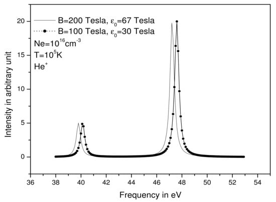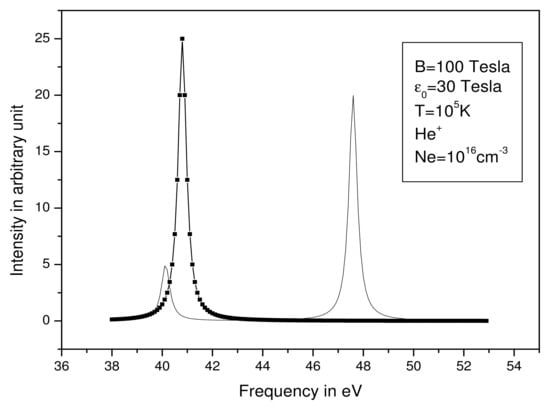In Figure 1 and Figure 2 (Figure 1 contains the line without magnetic field, B = 0), we present the Ly-alpha line for Hydrogen-like Helium for = 10 cm, 10 K, = 100 Tesla, and = 30 Tesla and for = 200 Tesla and = 67. The presence of the magnetic field enhances the degeneracy removal and the gives the profile two peaks; increasing the value of the field ( = 200 Tesla and = 67 Teslas), we notice a shift of the centers of the two peaks towards the small frequencies towards the red). We can interpret the shift as follows: from Equation (43), it is clear that the effect of the magnetic field on the energy levels makes these levels far from each other when increasing the value of this field. Consequently, the center of the line, which is the energy difference between these levels, moves with the increasing magnetic field. Then, the center of the line undergoes a shift.