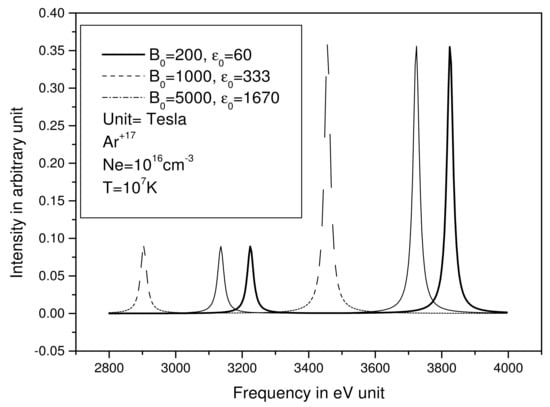 For the Ly-alpha line for Hydrogen-like Argon for = 10 cm, K, = 200 Tesla, and = 68 Teslas, = 1000 Teslas and = 333 Teslas, and = 5000 Tesla and = 1670, in this case, we observe a noticeable shift towards the red, going from 1000 Tesla to 5000 Tesla; the second peak is shifted about 267 eV (Figure 4). In all figures, we used a convolution product to introduce the Doppler broadening, and the final profile will not be a Gaussian profile but a convolution between the Gaussian and the Zeeman effect.