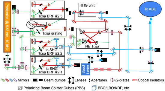 The Z-type Ti:sa cavities of GISELE (see Figure 3) are broadband (BB) cavities, having either a birefringent filter (BRF) plus etalon, or grating as wavelength selective elements and achieving a typical linewidth of 5–10 GHz of the fundamental output frequency [26,27]. A Z-type cavity using two etalons is available, for achieving a narrower linewidth of 1.5–2 GHz [28]. For narrowband (NB) spectroscopy, an injection-locked pulsed-Ti:sa ring laser is available, seeded by an external cavity diode laser (ECDL), achieving linewidths, , of ≤50 MHz [29]. The ECDL system requires feedback protection, which is provided by optical isolators. Typical output powers with standard 10 W pumping power of these Ti:sa systems are 2.2–2.7 W.