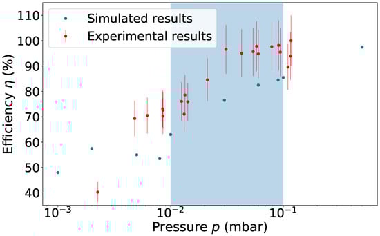 Experimental and simulated SRFQ and mRFQ transmission efficiency as a function of pressure p. Necessary p conditions for a matched hypersonic jet of Mach number 7–8 are highlighted by the region of interest in light blue.