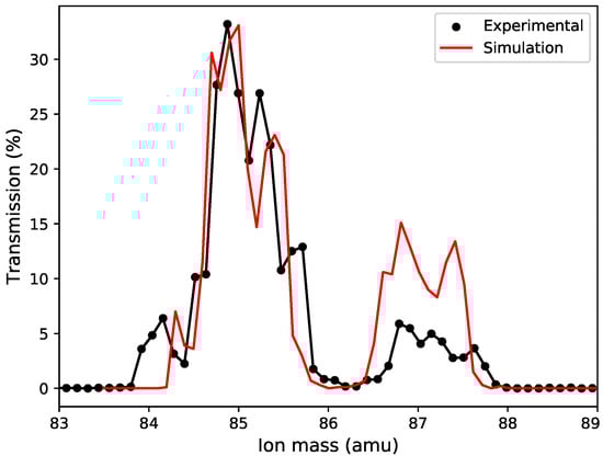 Experimental load–line scan of the QMF for a fixed DC to RF amplitude ratio of 0.166, compared with a SIMION simulation performed with the same parameters. The mass axis is calibrated so that the left peak corresponds to Rb.